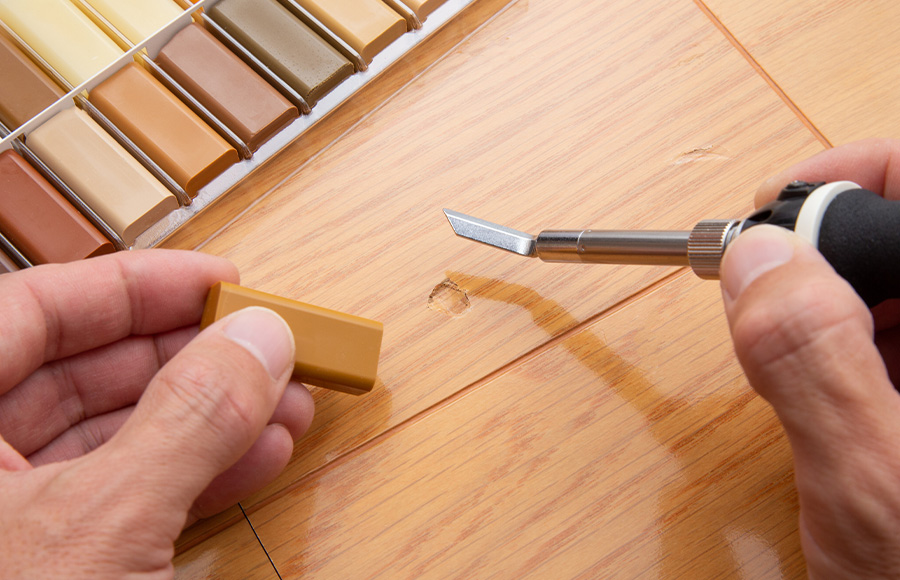 現場の光や木目の色味に合わせて、その場で塗料を調合します。熟練の技術で色と艶を再現し、どこにキズがあったのか分からないほどの自然な仕上がりを実現します。